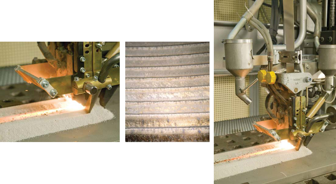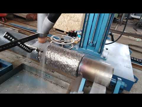 ΠΡΠΈ ΠΏΡΠΎΠ΄ΠΎΠ»ΡΠ½ΠΎΠΉ Π½Π°ΠΏΠ»Π°Π²ΠΊΠ΅ ΡΠ»ΠΈΡΠ΅Π² Π΄Π΅ΡΠ°Π»Ρ, ΡΡΡΠ°Π½ΠΎΠ²Π»Π΅Π½Π½Π°Ρ Π² ΡΠ΅Π½ΡΡΠ°Ρ ΡΠΎΠΊΠ°ΡΠ½ΠΎΠ³ΠΎ ΡΡΠ°Π½ΠΊΠ°, ΠΎΡΡΠ°Π΅ΡΡΡ Π½Π΅ΠΏΠΎΠ΄Π²ΠΈΠΆΠ½ΠΎΠΉ, Π° ΡΡΠΏΠΏΠΎΡΡ ΡΡΠ°Π½ΠΊΠ° Π½Π°ΠΏΠ»Π°Π²ΠΎΡΠ½ΠΎΠΉ Π³ΠΎΠ»ΠΎΠ²ΠΊΠΎΠΉ ΡΠΎΠ²Π΅ΡΡΠ°Π΅Ρ ΠΏΡΠΎΠ΄ΠΎΠ»ΡΠ½ΡΡ ΠΏΠΎΠ΄Π°ΡΡ. ΠΠΎΡΠ»Π΅ Π½Π°Π»ΠΎΠΆΠ΅Π½ΠΈΡ ΠΎΠ΄Π½ΠΎΠ³ΠΎ ΠΏΡΠΎΠ΄ΠΎΠ»ΡΠ½ΠΎΠ³ΠΎ Π²Π°Π»ΠΈΠΊΠ° Π΄Π΅ΡΠ°Π»Ρ ΠΏΠΎΠ²ΠΎΡΠ°ΡΠΈΠ²Π°ΡΡ Π½Π° 180Β°, Ρ ΠΏΡΠΎΡΠΈΠ²ΠΎΠΏΠΎΠ»ΠΎΠΆΠ½ΠΎΠΉ ΡΡΠΎΡΠΎΠ½Ρ Π΅Π΅ Π½Π°ΠΏΠ»Π°Π²Π»ΡΡΡ ΡΠ»Π΅Π΄ΡΡΡΠΈΠΉ Π²Π°Π»ΠΈΠΊ.