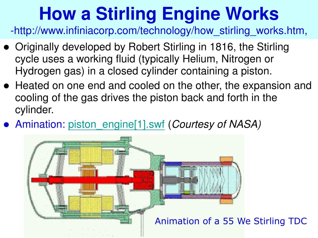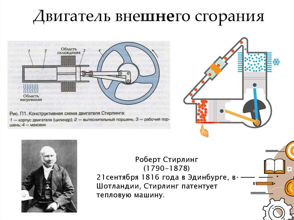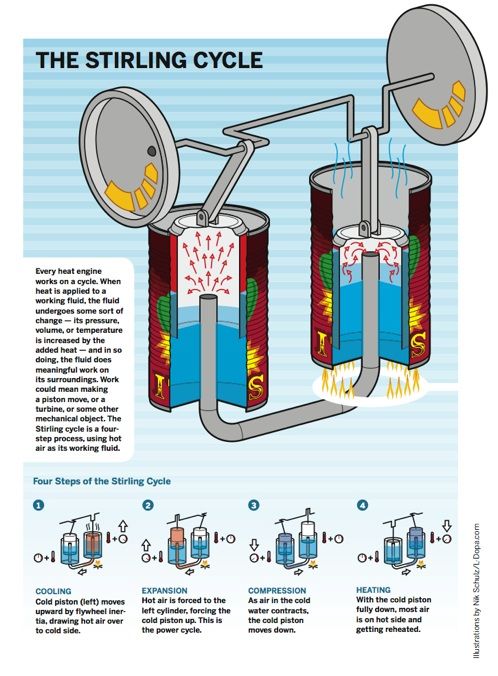 - В цикле Стирлинга используется внешний источник тепла, которым может быть что угодно, от бензина до солнечной энергии и тепла, выделяемого разлагающимися растениями. В цилиндрах двигателя не происходит сгорания.