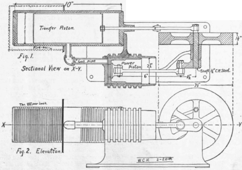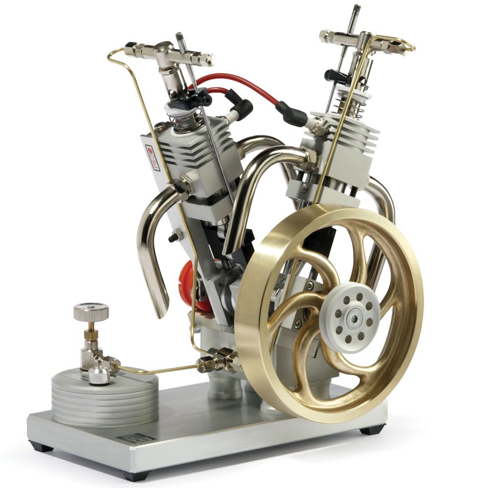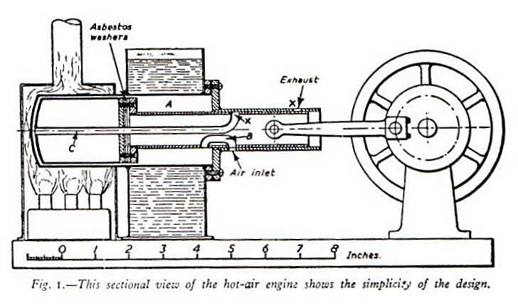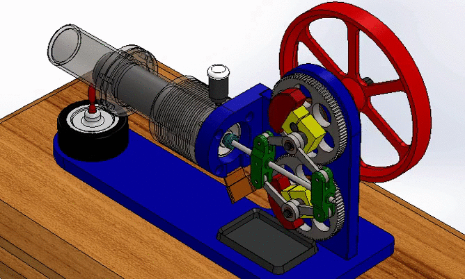 В этом двигателе нагретый цилиндр нагревается внешним пламенем. Охлаждаемый цилиндр имеет воздушное охлаждение и имеет ребра для облегчения процесса охлаждения. Шток, выходящий из каждого поршня, соединен с небольшим диском, который, в свою очередь, соединен с большим маховиком. Это удерживает поршни в движении, когда двигатель не вырабатывает мощность.