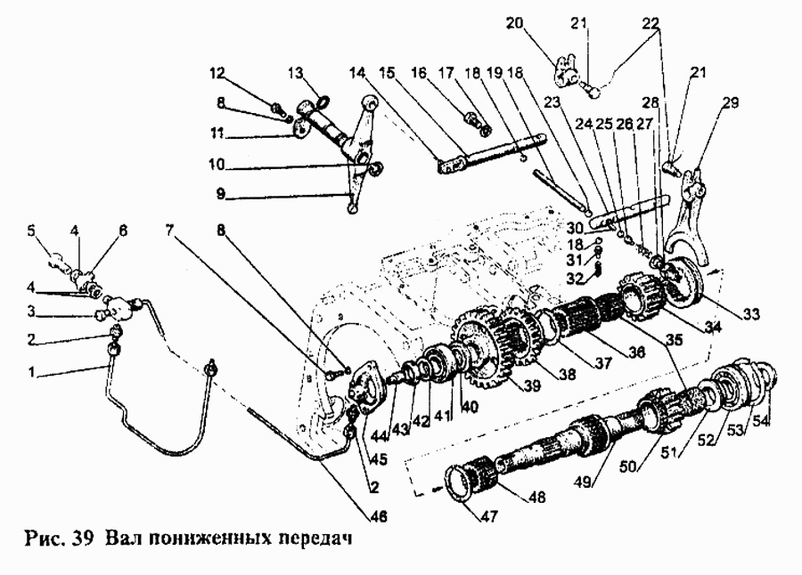 Вал с блоком шестерён установлен в корпусе на двух подшипниках (27 и 35). Шестерни посажены на шлицы и зафиксированы стопорным кольцом. Ведомая шестерня (31) привода синхронного режима ВОМ вращается на двух роликовых подшипниках (28 и 30). рис. схема кпп