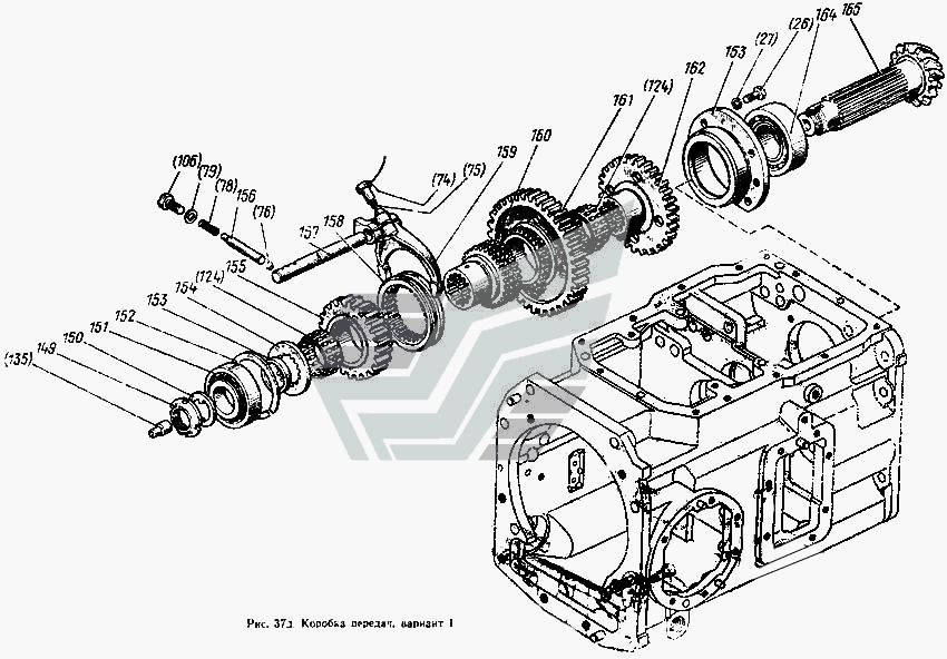 Все пакеты деталей на первичном, вторичном, промежуточном и вале пониженных передач и заднего хода затянуты гайками.