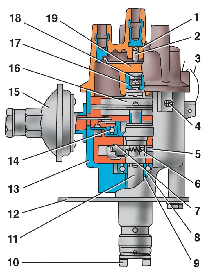 Датчик-распределитель имеет корпус, крышку, валик, датчик синусоидального напряжения, центробежный и вакуумный регуляторы, а также октан-корректор.