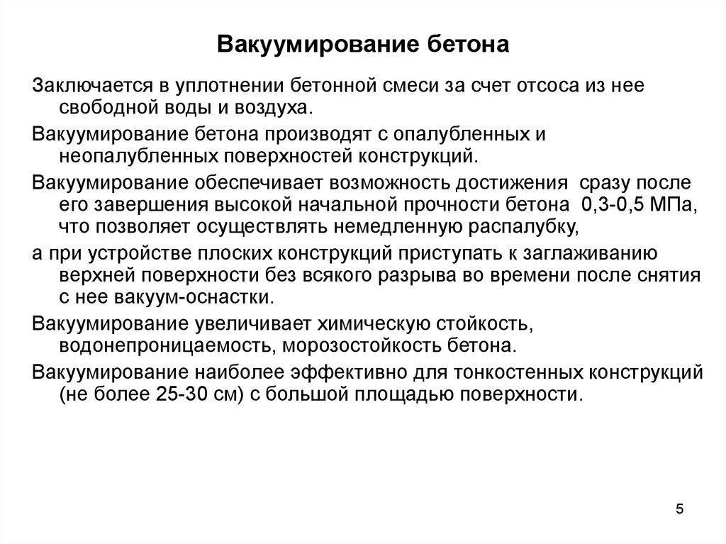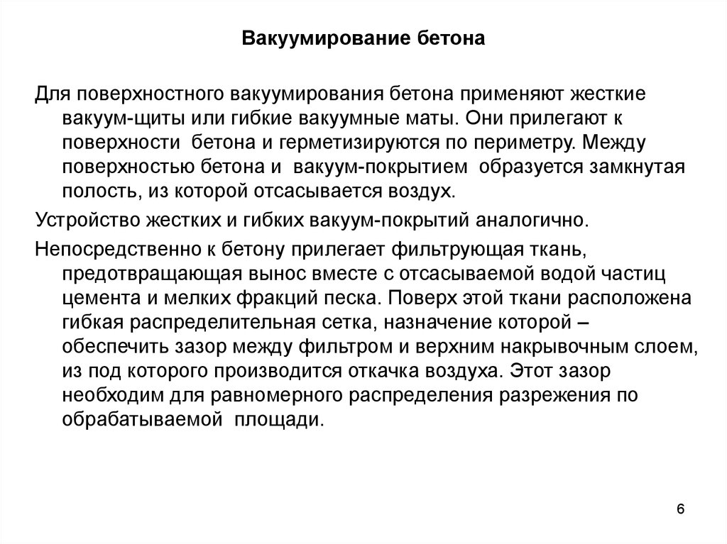 Повышается прочность бетона и его стойкость к износу и коррозии, уменьшается общая усадка. Бетон, обработанный вакуумом, обеспечивает хорошее сцепление с подстилающий бетон.