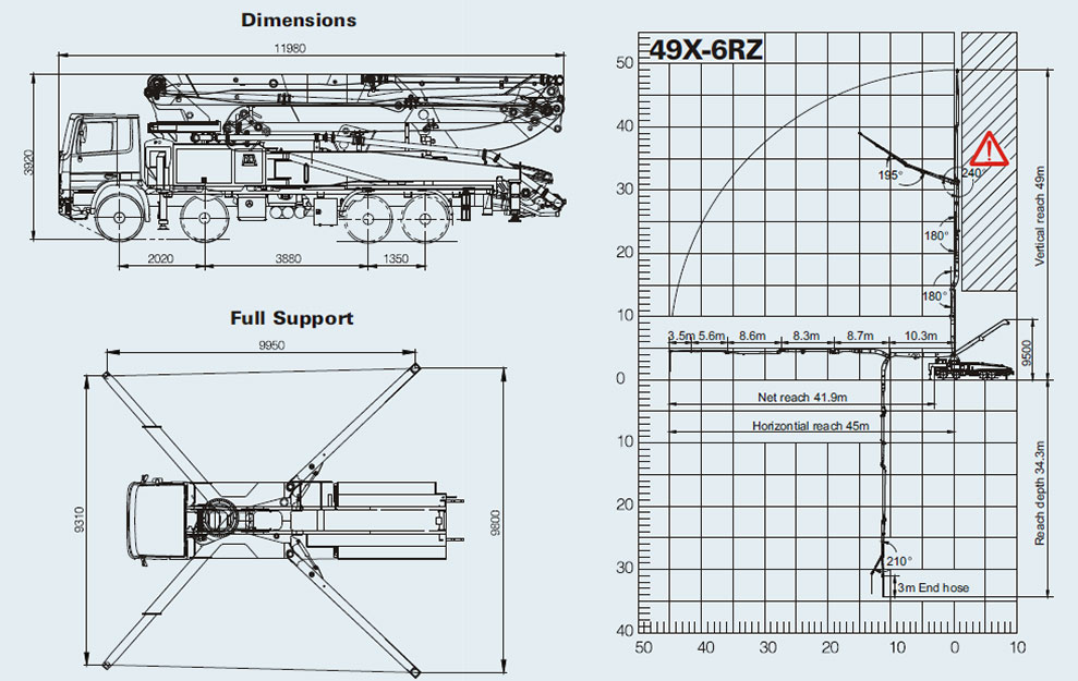 - 57X-6RZ: Модель 57X-6RZ идеально подходит для средних и крупных строительных работ, поскольку это самый длинный и производительный стреловой насос, который мы предлагаем. Эта модель имеет впечатляющий вертикальный и горизонтальный радиус действия, что делает ее идеальной для труднодоступных мест и высоких зданий.