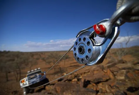 Удерживающие блоки могут служить двум целям при эвакуации внедорожника: 1) увеличение тягового усилия лебедки и 2) перенаправление силы троса лебедки для вытягивания застрявшего автомобиля под разными углами.