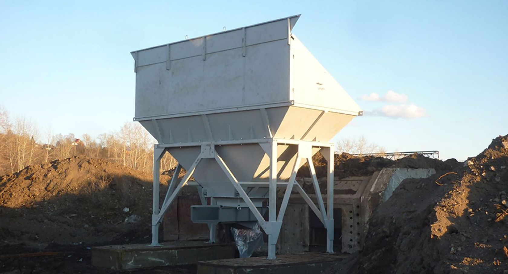 - Приемные бункера инертных материалов на раме, стандартно 3 бункера по 10 м3 каждый (на выбор 2 / 3 / 4 бункера по 10 / 15 / 20 / 25 м3 каждый) — 2 комплекта