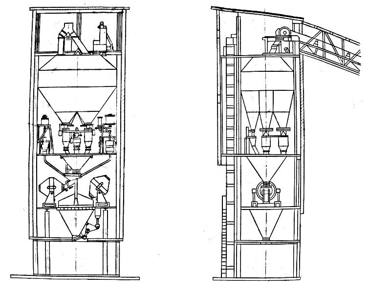 Сэндвич-панели толщиной 100 мм, утеплитель пенополистирол или минеральная плита. В комплектацию входят входные и оконные группы, несущие металлоконструкции, механизированные утепленные крышки приемных бункеров