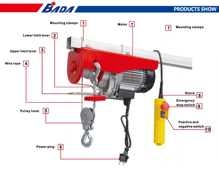 - Электрические тали оборудуются ограничителем грузоподъёмности и ограничителем нижнего положения крюковой подвески.