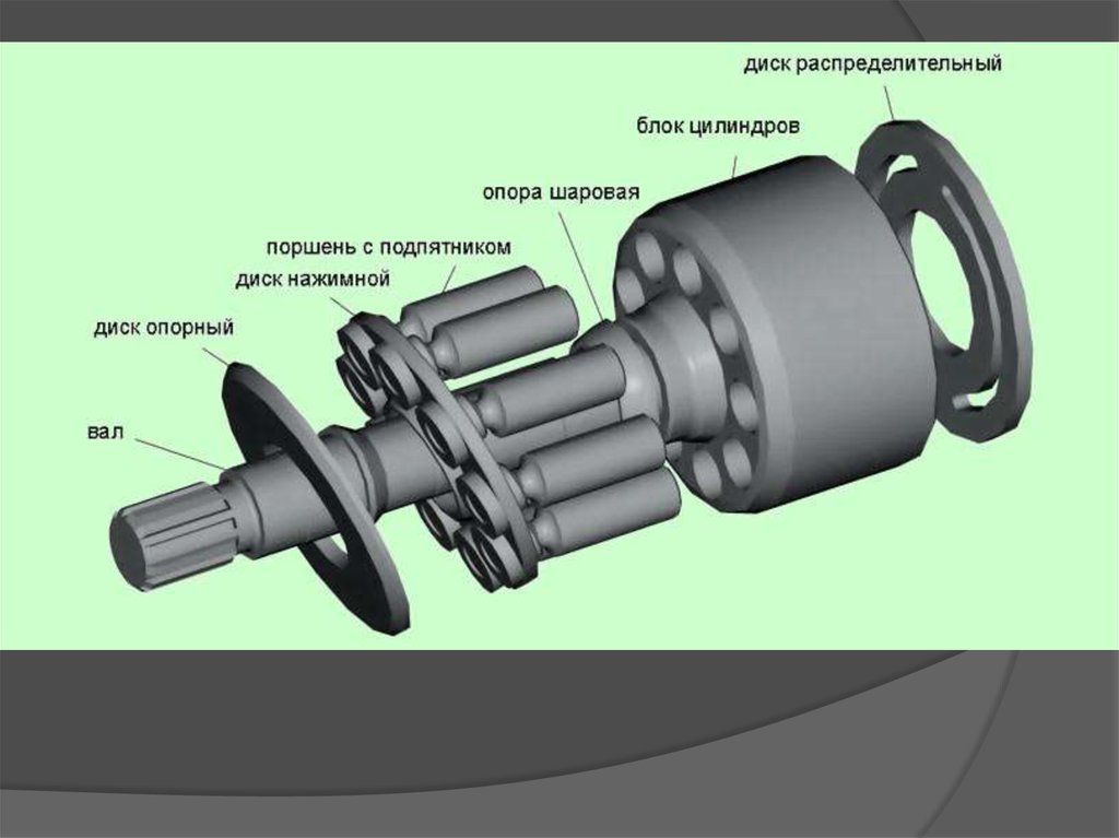 Аксиально-поршневые. Поршень при движении совершает поворот на 180⁰. Цикл всасывания происходит при следующем повороте. Этот вид гидродвигателей выдерживает значительные нагрузки, поэтому широко используется в экскаваторах, сельхозмашинах, карьерной технике. -