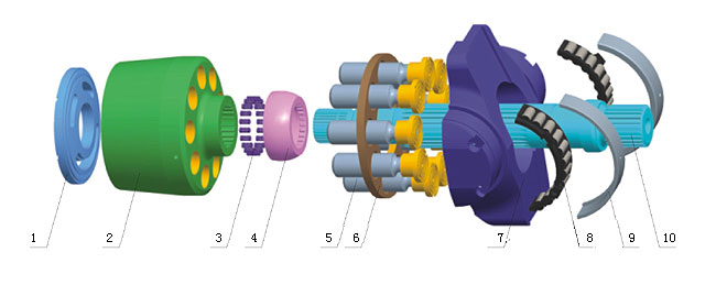 По конструкции агрегаты схожи. Главное отличие насоса в том, что он создает осевое давление. Распределительная шайба насоса содержит одну дроссельную канавку, у двигателей их две. Также у насоса имеется одно отверстие с большим диаметром для предотвращения кавитации жидкости на высоких оборотах.