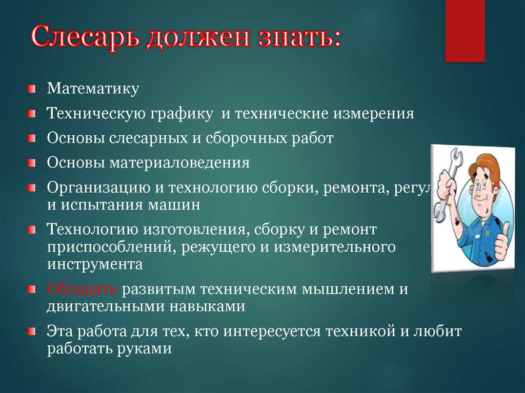 Должен знать: устройство ремонтируемого оборудования; назначение и взаимодействие основных узлов и механизмов; технологическую последовательность разборки, ремонта и сборки оборудования, агрегатов и машин; технические условия на испытание, регулировку и приемку узлов и механизмов; основные свойства обрабатываемых материалов; устройство универсальных приспособлений и применяемых контрольно-измерительных инструментов; систему допусков и посадок, квалитеты и параметры шероховатости; правила строповки, подъема, перемещения грузов; правила эксплуатации грузоподъемных средств и механизмов, управляемых с пола.