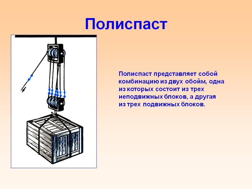 При строительных, монтажных и такелажных работах распространено использование состоящего из двух блоков (подвижный и неподвижный) грузоподъемного устройства – полиспаста.