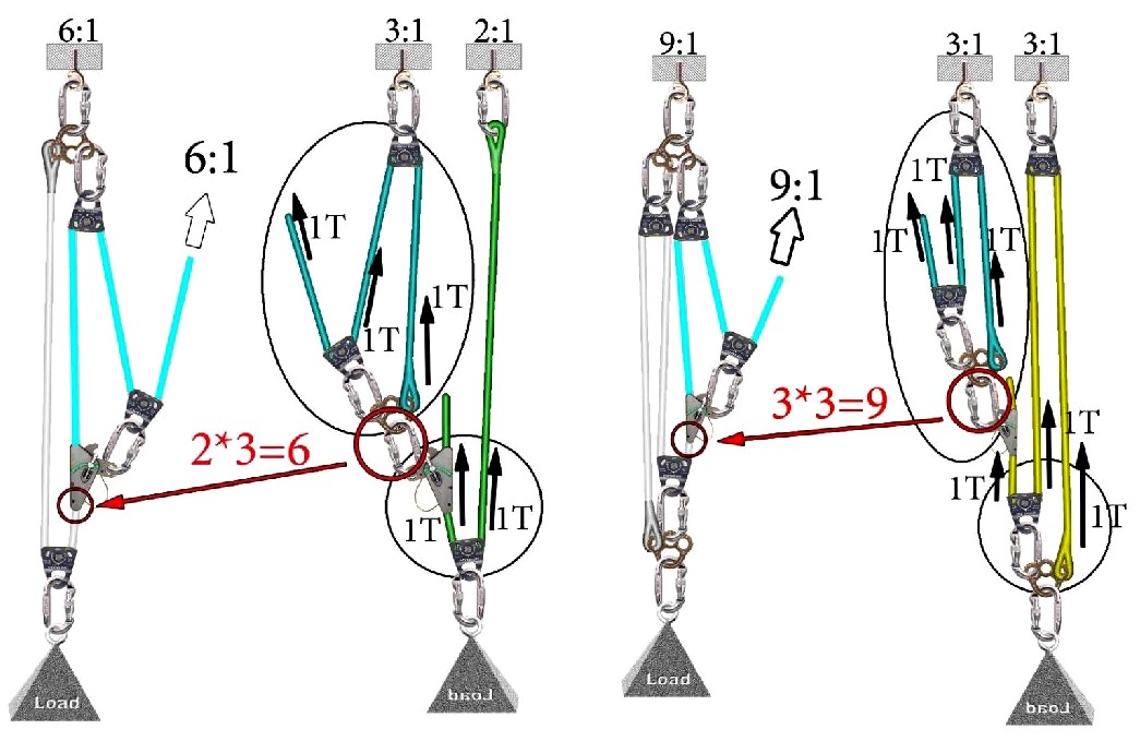 Например: если в показанном на рис. 2 полиспасте 2:1 на каждый метр подъема груза вверх надо протянуть через систему 2 метра веревки, то в полиспасте 6:1 – соответственно 6 метров.