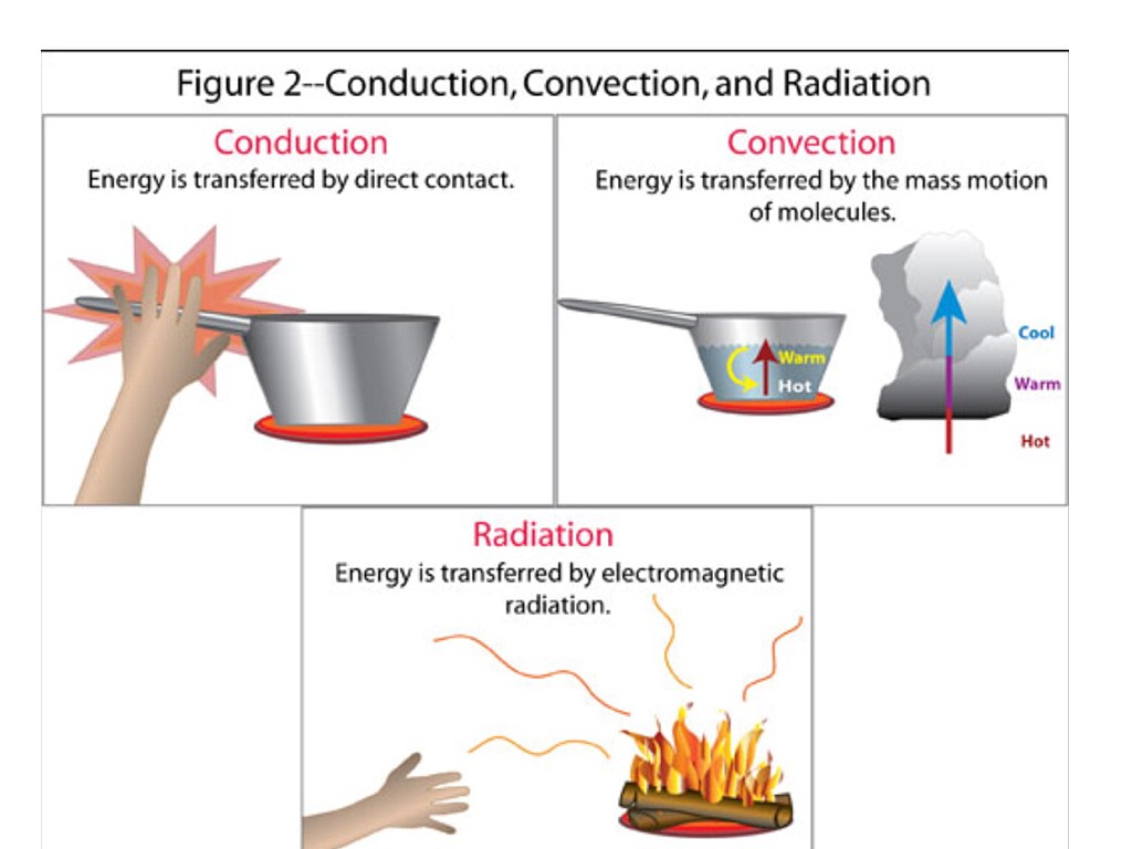 Теплопроводность возникает при передаче тепла при прямом контакте между двумя объектами. Конвекция возникает, когда тепло передается через контакт между жидкостью и объектом. Радиация – это передача тепла посредством электромагнитного излучения.
