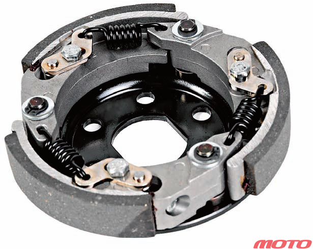 Центробежная муфта работает, как следует из названия, за счет центробежной силы. Ключевыми компонентами центробежного сцепления являются ступица, противовесы (колодки сцепления), пружины, накладки и корпус (показаны на схеме ниже).