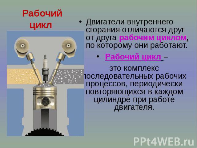 Рабочим циклом двигателя называется ряд последовательных, периодических повторяющихся процессов в цилиндрах, в результате которых тепловая энергия топлива преобразуется в механическую работу.