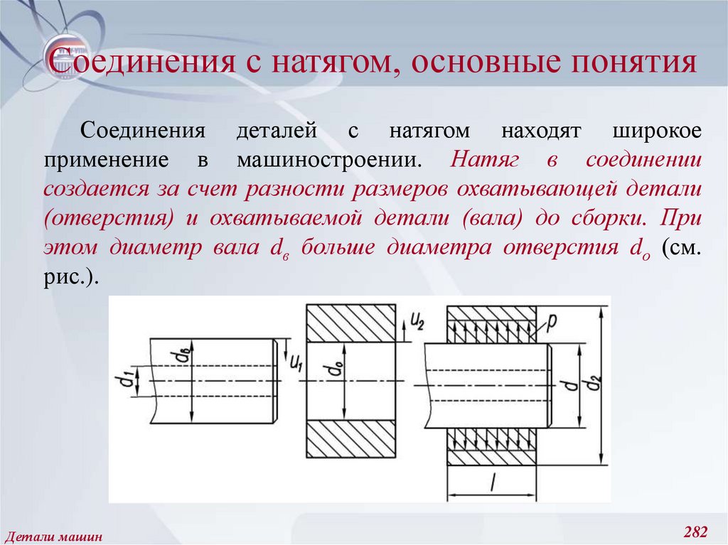 Соединения такого характера получаются в том случае, если до сборки сопряженных деталей диаметр вала несколько больше диаметра отверстия, в связи с чем после сборки деталей между ними возникает напряженное состояние.