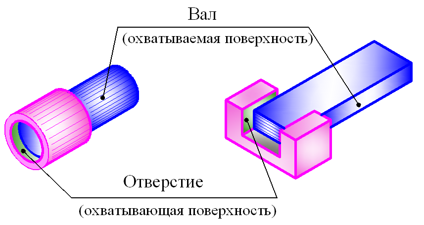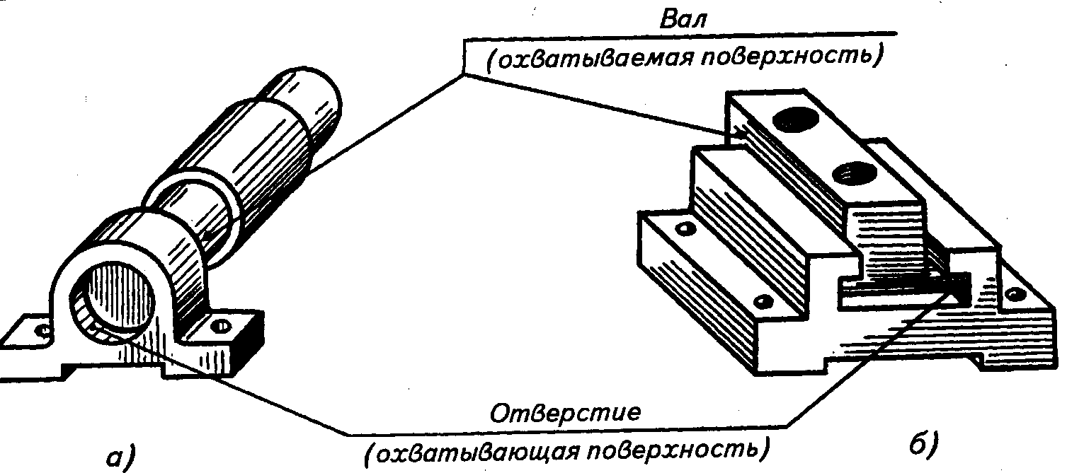Охватывающие и охватываемые детали. При сопряжении двух деталей одна из них как бы охватывает другую, поэтому первая из этих деталей (по отношению к другой) называется охватывающей, а вторая — охватываемой.