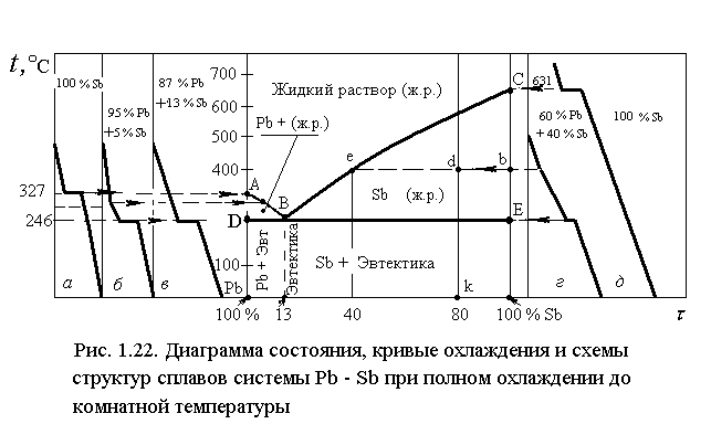 В данном случае фазовые превращения рассматриваются на примере системы “свинец — сурьма”. Эту систему образуют два компонента (К = 2) — свинец (Pb) и сурьма (Sb). Максимальное число фаз — три (Ф = 3): жидкий раствор (Ж), кристаллы Pb, кристаллы Sb. Общий вид диаграммы с кривыми охлаждения приведены на рисунок 24.
