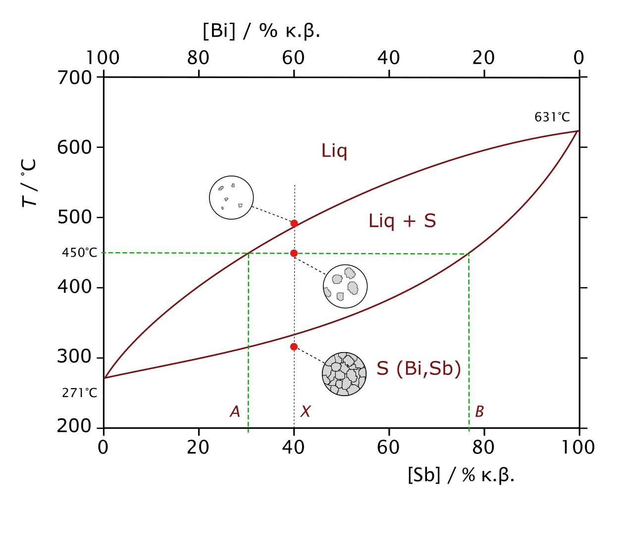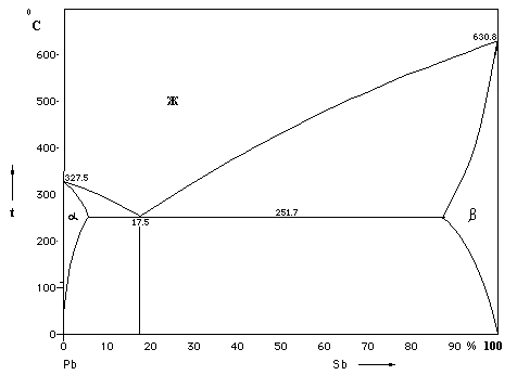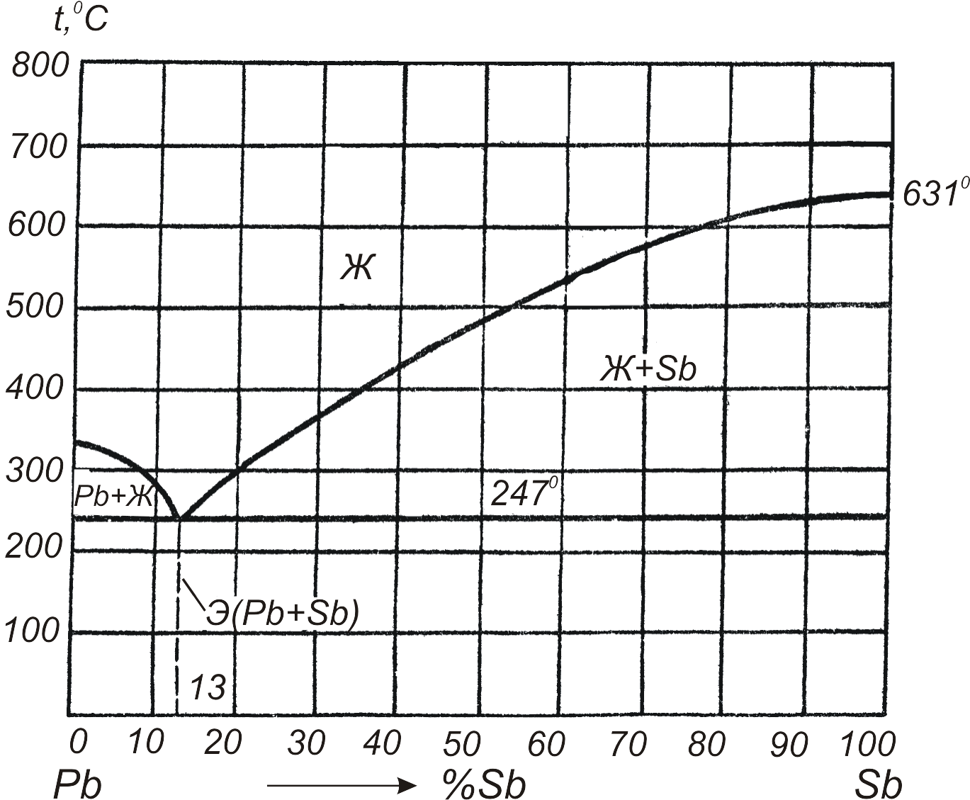 В приведенном примере эвтектику образуют кристаллы свинца и сурьмы. Для ее образования жидкая фаза должна иметь строго определенное соотношение компонентов – 87 % Pb и 13 % Sb. Cплав с таким соотношением компонентов называется эвтектическим.