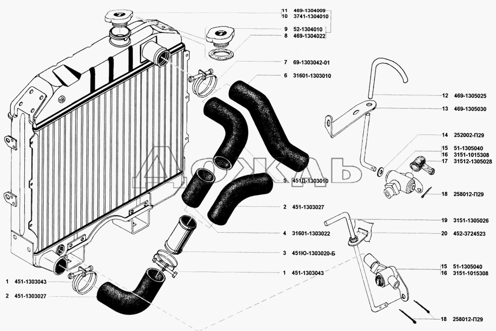 - 3163-1303010 – верхний подводящий патрубок;