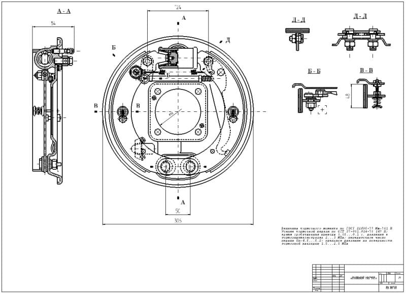 Тормозной механизм, смонтированный на круглом тормозном щите, неподвижно устанавливается на ступице колеса, сверху его закрывает тормозной барабан, соединенный с ведущей осью. На барабан устанавливается колесо и обе эти детали вращаются как единое целое, торможенное колеса обеспечивается взаимодействием барабана и тормозных колодок.