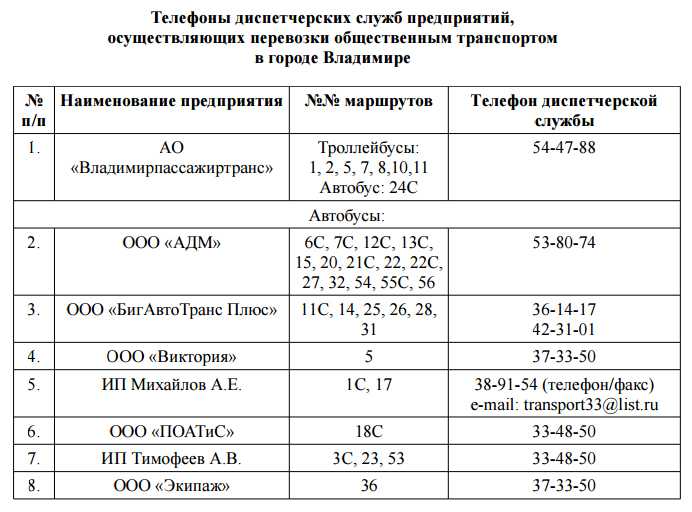 Список перевозчиков и диспетчеров — Центр организации и контроля пассажироперевозок