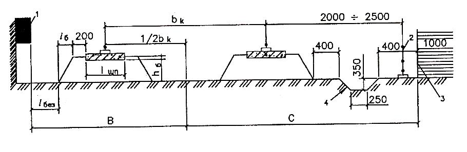 Нижнее строение пути включает в себя спрофилированное земляное полотно с продольным уклоном 0,002…0,004 и поперечным 0,008…0,0]0. В хорошо дренирующих и скальных породах земляное полотно допускается выполнять горизонтальным. На стороне пути, удаленной от здания, устраивают продольную канавку-водоотвод 2. В случае большой ширины колеи (более 4 м) устраивают вторую канавку-водоотвод посередине между рельсами.
