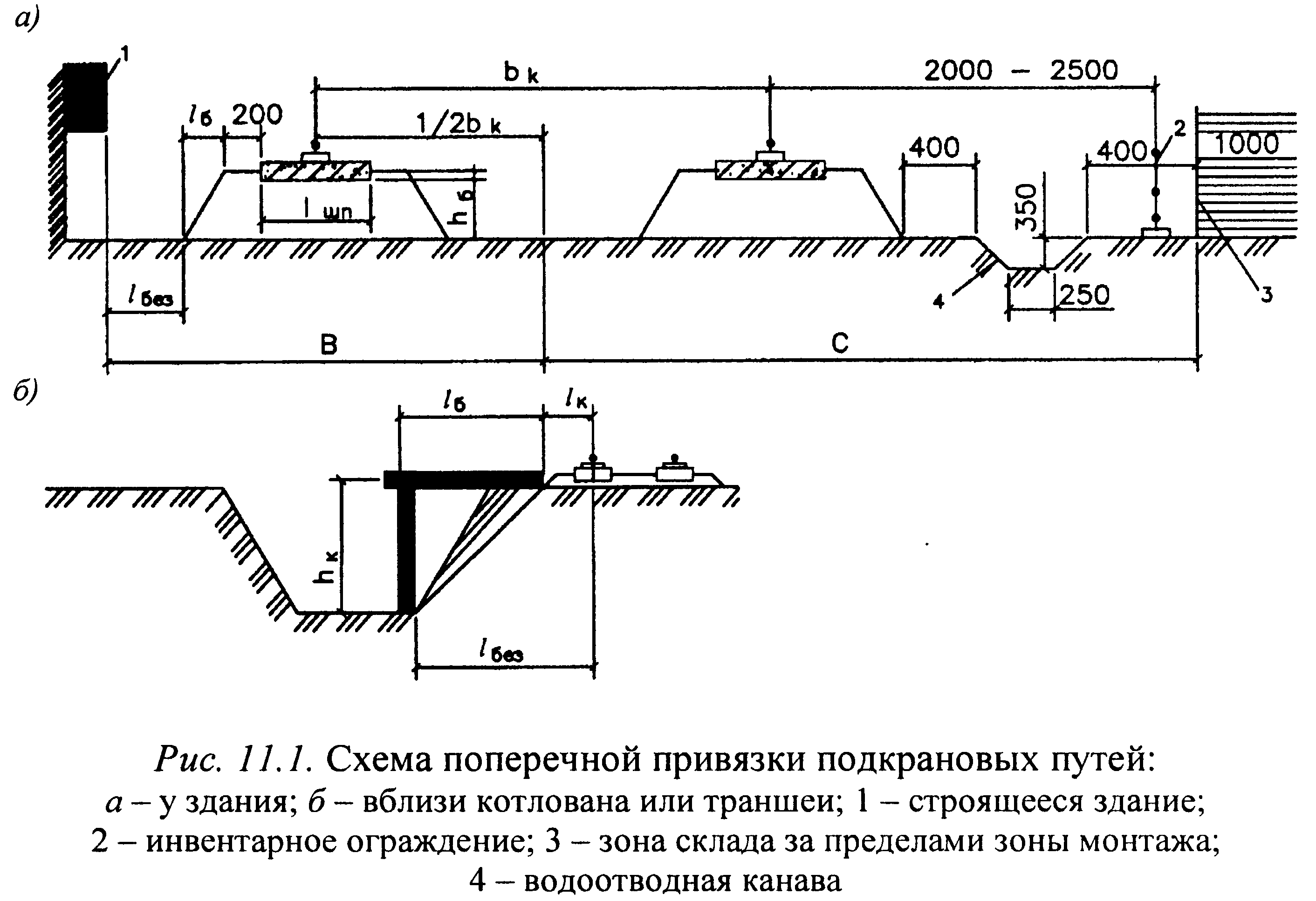 Длина укладываемых путей зависит от размеров возводимого здания. При укладке путей (рис. 118, а, б) во избежание зашемления людей между краном и зданием обеспечивают минимально безопасное расстояние А (не менее 1 м) между выступающими частями крана и ограждающими конструкциями (балконами) здания на высоте h до 2 м от уровня рельсов.