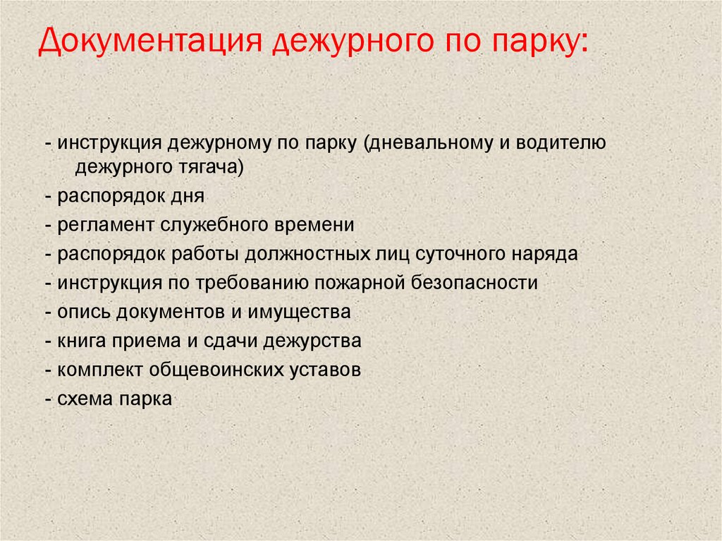 Перед сдачей дежурства дежурный по парку готовит к сдаче рабочее место;