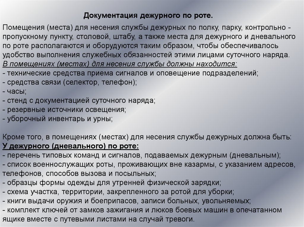 находиться в отведенном для него помещении; отправляясь по делам службы с разрешения дежурного по полку, оставлять за себя дневального свободной смены (очередного дневального) и сообщать ему, куда и на какое время отлучается;