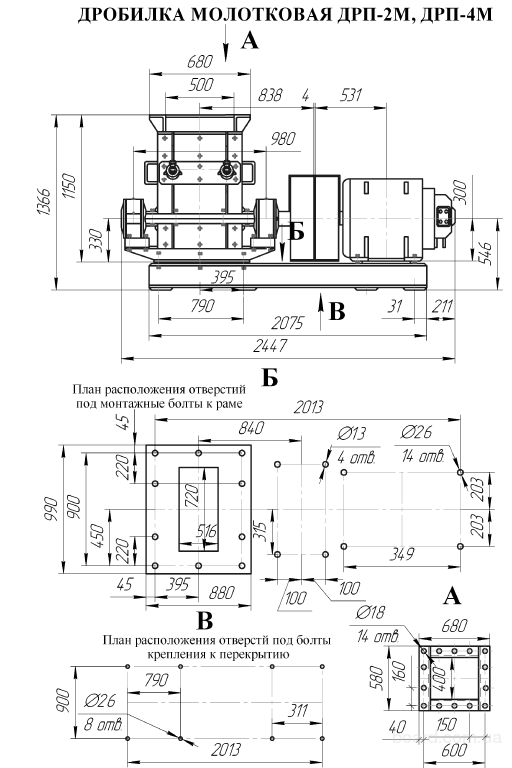 Габаритный и присоединительный чертёж молотковой дробилки МПС-630