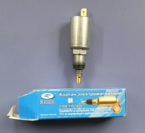 Электромагнитный клапан карбюратора – исполнительное устройство системы, прекрывающее своей иглой, по команде блока управления, отверстие в топливном жиклере системы ХХ, тем самым прекращая через нее подачу топлива. Установлен в карбюраторе.
