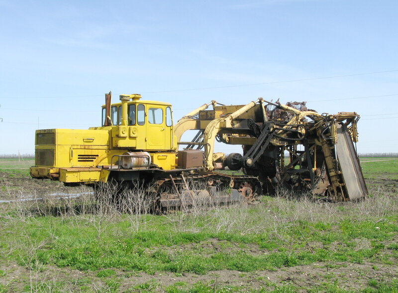 Тягач изготовляют преимущественно на базе тракторных узлов. Для снижения удельных давлений на грунт его ходовые устройства удлиняют по сравнению с тракторными, а для обеспечения продольной устойчивости наиболее тяжелые агрегаты, например, силовую установку располагают в передней части тягача. При необходимости там же устанавливают дополнительный противовес. На тягаче также монтируют раму для его соединения с рабочим органом. Рабочий орган выполняют в двух вариантах: в виде колеса (ротора) с расположенными по его периферии ковшами или в виде ковшовой цепи.