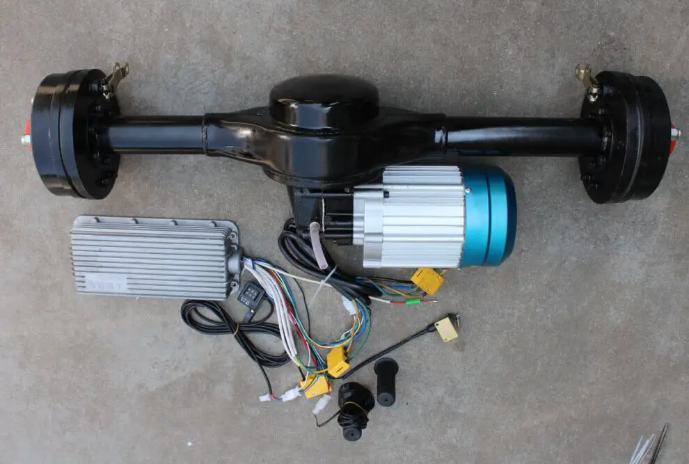 - Понижающий редуктор модулирует вращение двигателя и передает мощность на колеса (приводной вал), аналогично классической передаче.