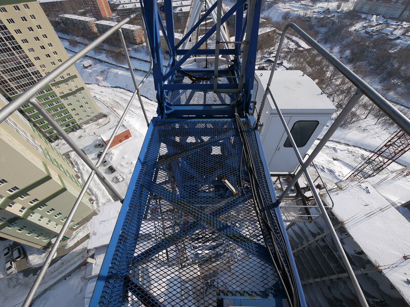 Поднимаемся в неё по пролётам, лифта нет. Туалета тоже нет, приходится спускаться. На кран высотой с 17-этажный дом поднимаешься минут за 10.