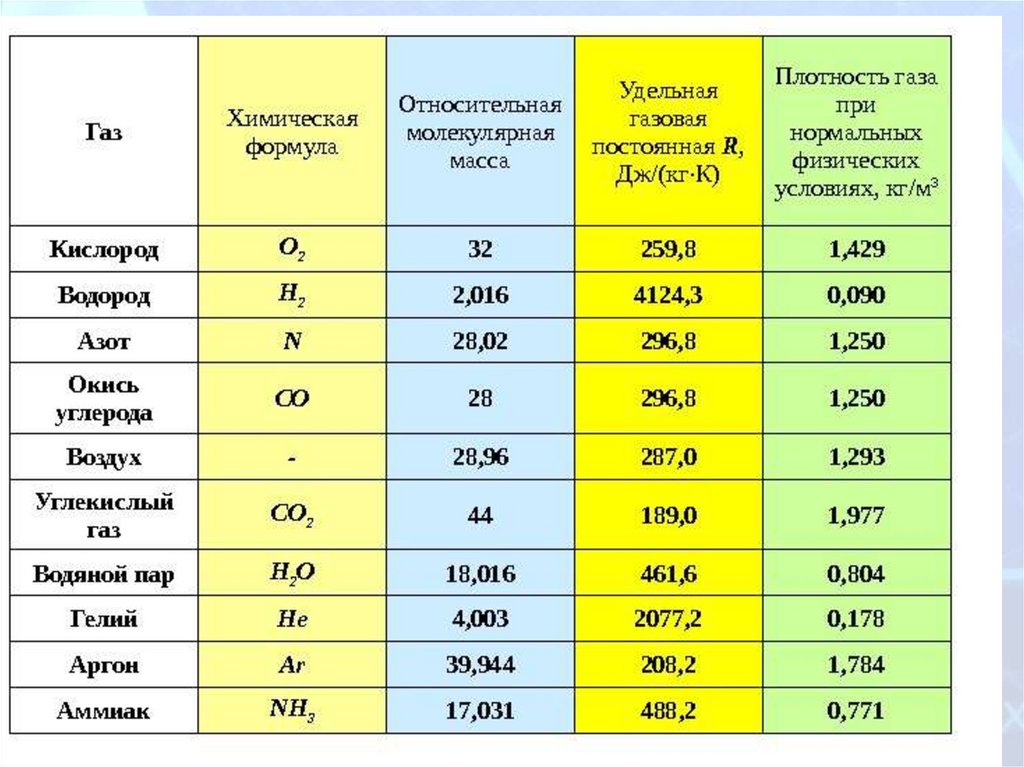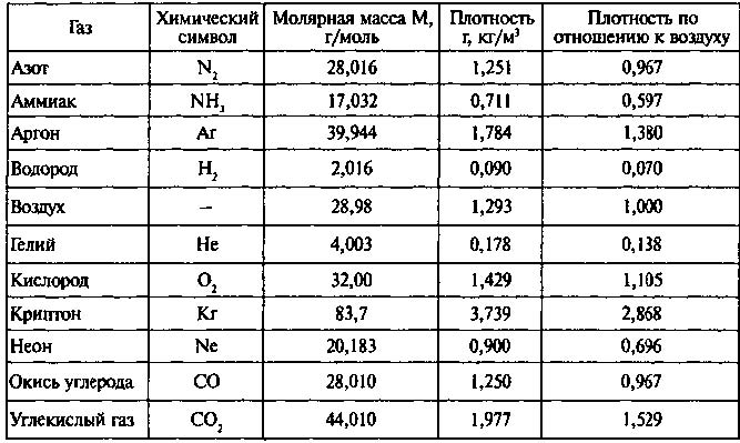 | ГАЗ | ФОРМУЛА | МОЛ. ВЕС | ОТН.ВЕС (Воздух=1) | ТОЧКА КИПЕНИЯ | ГОРЮЧЕСТЬ |
