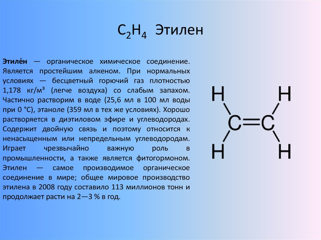 | Этилен(Этен) | С2Н4 | 28 | 0,971 | — 103.8 °C | Да |