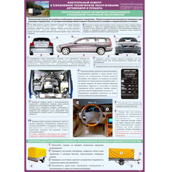 Перед выездом нужно удостовериться в том, что автомобиль находиться в рабочем состоянии. Для этого и предназначен ежедневный осмотр. Как правило, он включает в себя давление в колесах, работу осветительных приборов, звука, а также наличия масла в двигателе и охлаждающей жидкости, нормального уровня тормозной жидкости, гидроусилителя руля и омывающей жидкости или «незамерзайки». Такие процедуры могут предотвратить неприятные случайности на дорогах, а также подскажут водителю причины возможных неисправностей.