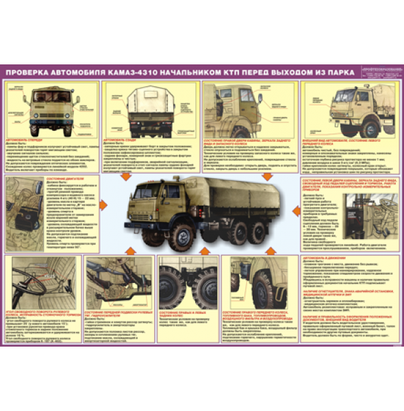 Контрольный осмотр автомобиля перед выходом из парка. Во время этого осмотра водитель проверяет чистоту автомобиля, наличие и исправность номерных и опознавательных знаков, количество горючего в баках, уровень масла в картере двигателя и охлаждающей жидкости в радиаторе. Затем он проверяет натяжение ремня вентилятора, компрессора, свободный ход рулевого колеса и педалей, крепление и шплинтовку соединительных тяг рулевого управления и тормозов. Внимательно осматривает шины, проверяет давление воздуха в них (включая и запасное колесо). Осмотрев аккумуляторную батарею и крепление зажимов проводов на ее штырях, водитель проверяет свет фар, подфарников, заднего фонаря, стоп-сигнала, указателей поворота и исправность светомаскировочных устройств.