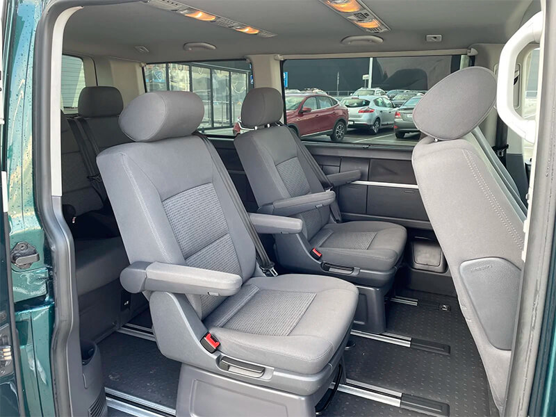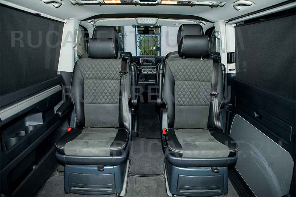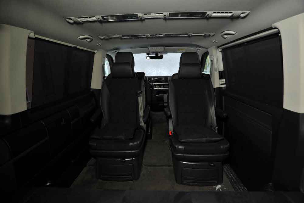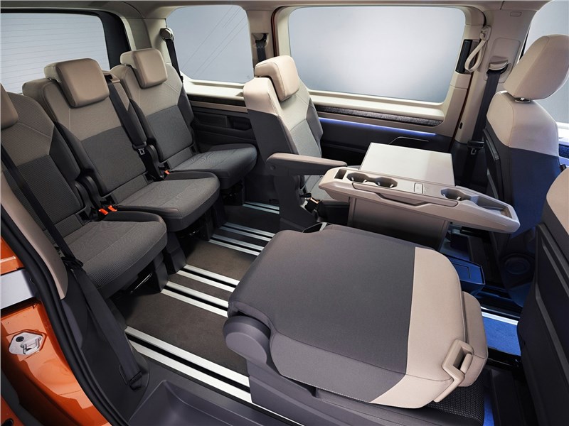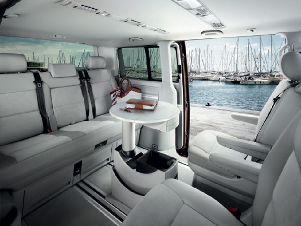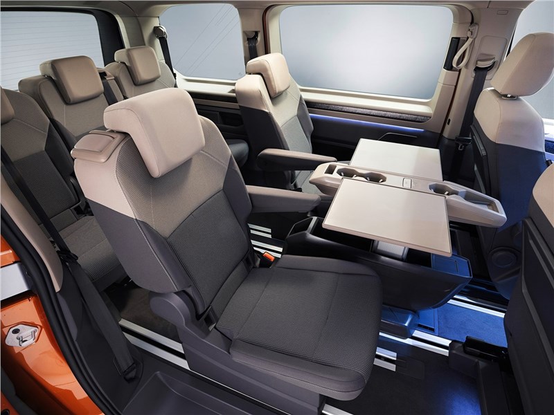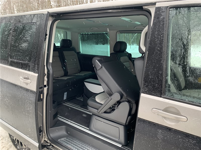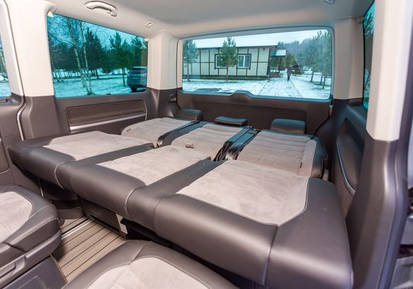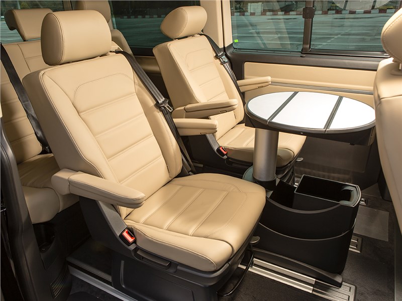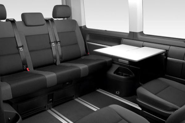 Сиденья второго ряда имеют регулируемую и складываемую спинку и регулируемые подлокотники, вращаются на 360 градусов (и для этого их не нужно вынимать из салона), а трехместный диван легко раскладывается в спальное место. Все сиденья в салоне можно свободно передвигать вперед/назад, не вынимая из рельсовых креплений, а при необходимости их можно полностью достать – таким образом минивэн Multivan легко можно превратить в грузовой фургон.