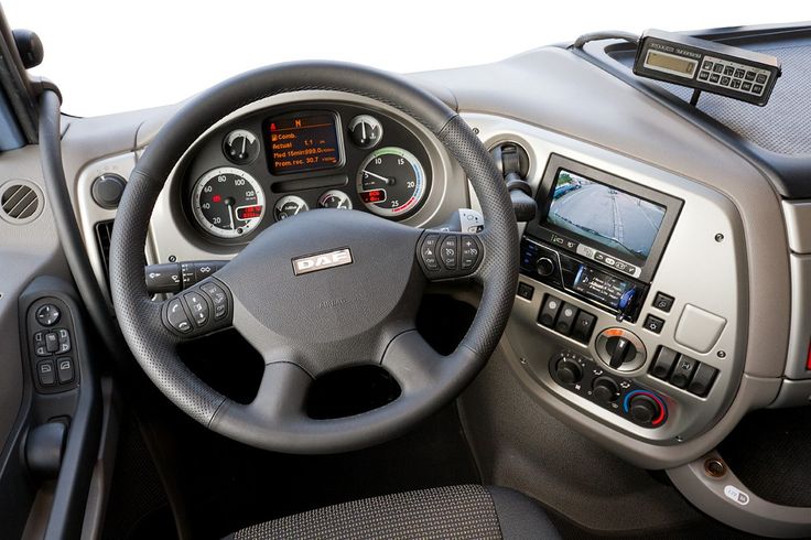Помимо обычных функций приборной панели, есть три слота DIN, которые позволяют установить аудиосистему, навигационную систему, дисплей камеры или бортовой компьютер. Другие функции включают адаптивный круиз-контроль, предупреждение о лобовом столкновении и систему камер DAF.