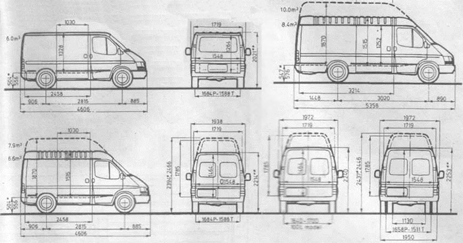 В настоящее время грузовые транзитные фургоны выпускаются с тремя различными колесными базами: