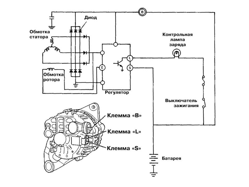 Для удобства и понимания действий, проводимых с генератором, рекомендуется изучить схему подключения. На рисунке показана схема проводов, которые используются в процессе зарядки.