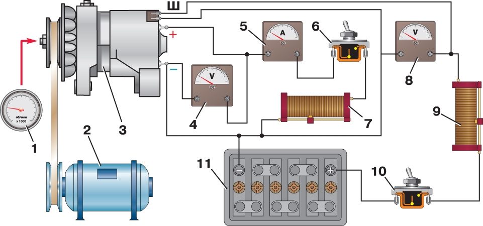 Регулятор напряжения тестируется при помощи лампы и подачи повышенного напряжения. Тщательно проверить генератор можно в условиях мастерской с использованием специального стенда.