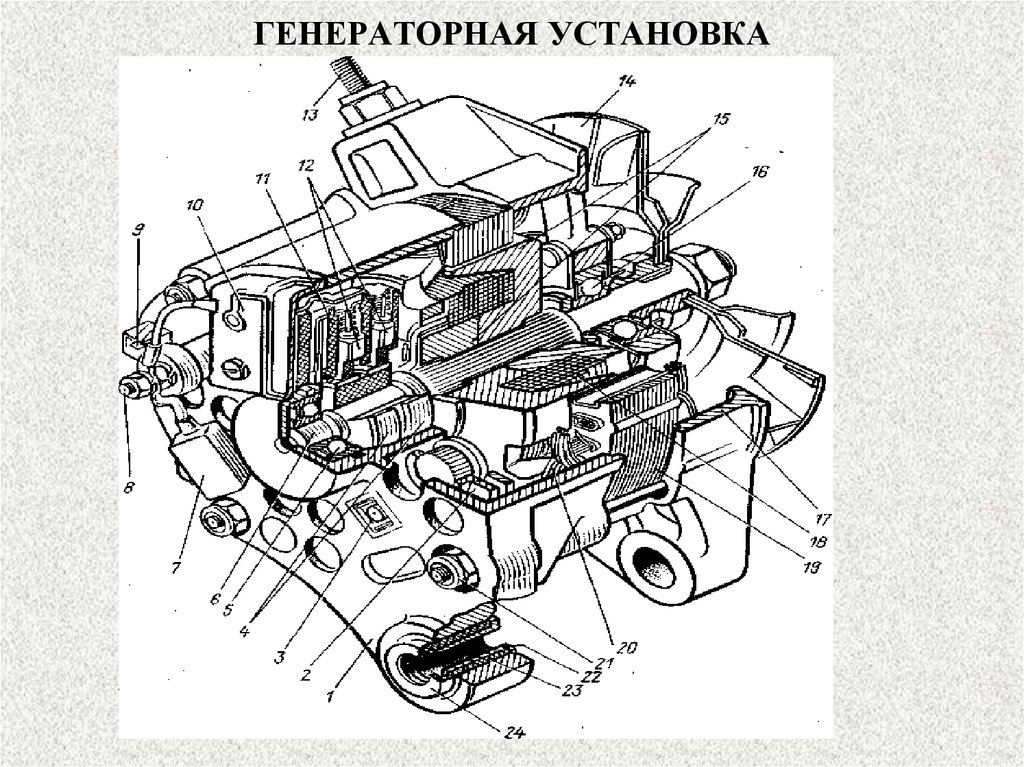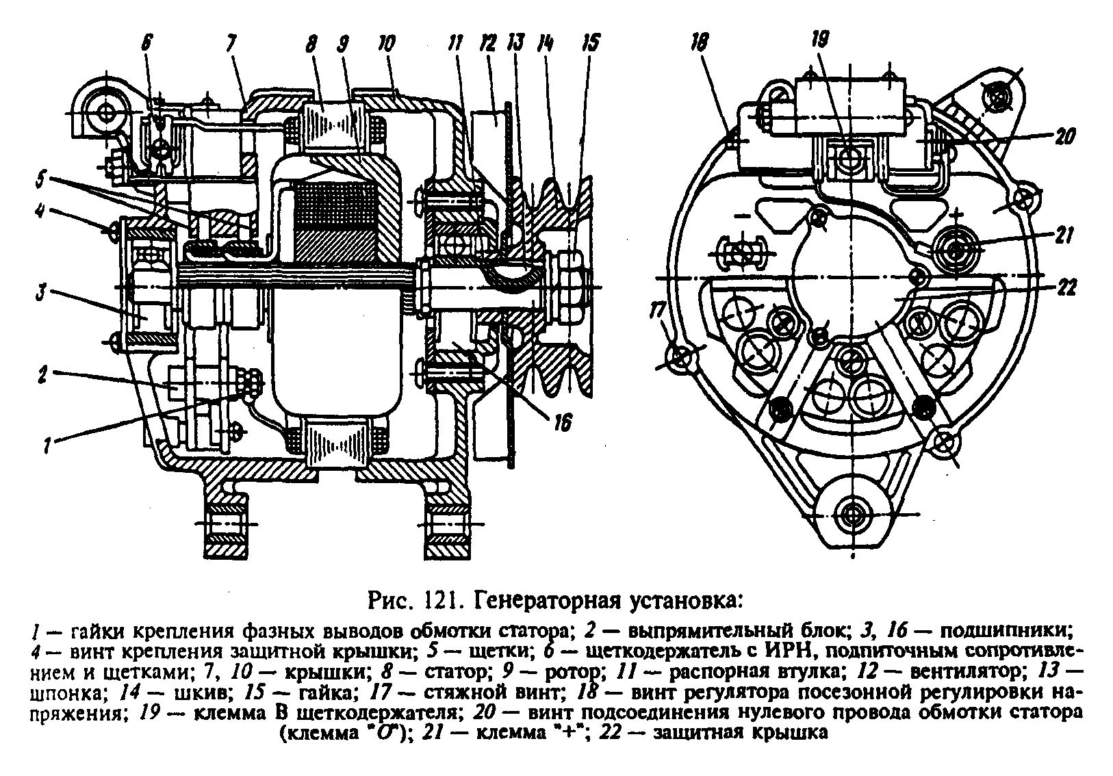 Большой диапазон изменения частоты вращения генератора вызывает изменение в широких пределах его напряжения. А так как потребители рассчитаны на работу при изменении напряжения в определенных пределах и то же требование предъявляется к напряжению заряда аккумуляторной батареи, в схемы генераторов включают устройство, обеспечивающее его стабилизацию— регулятор напряжения. Вместе генератор и регулятор напряжения образуют генераторную установку.