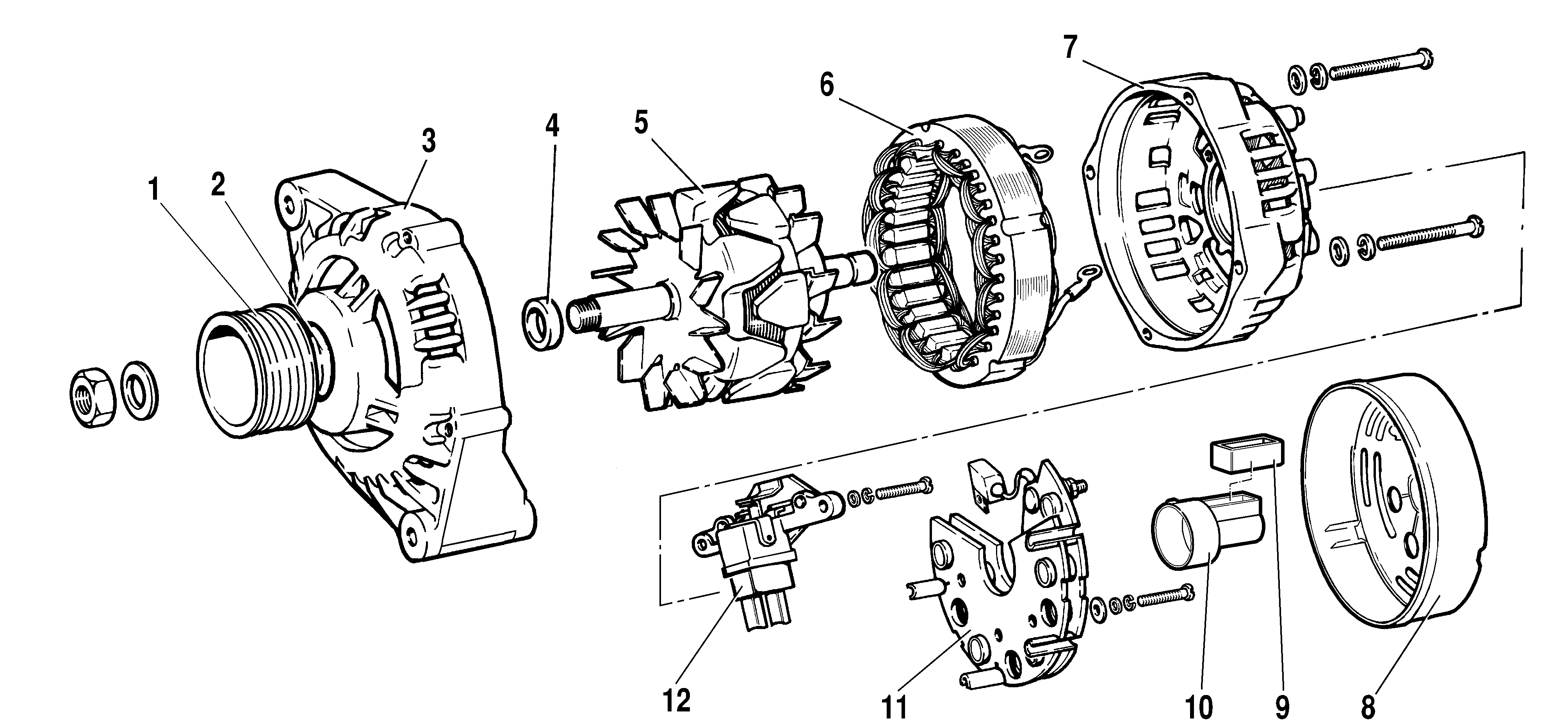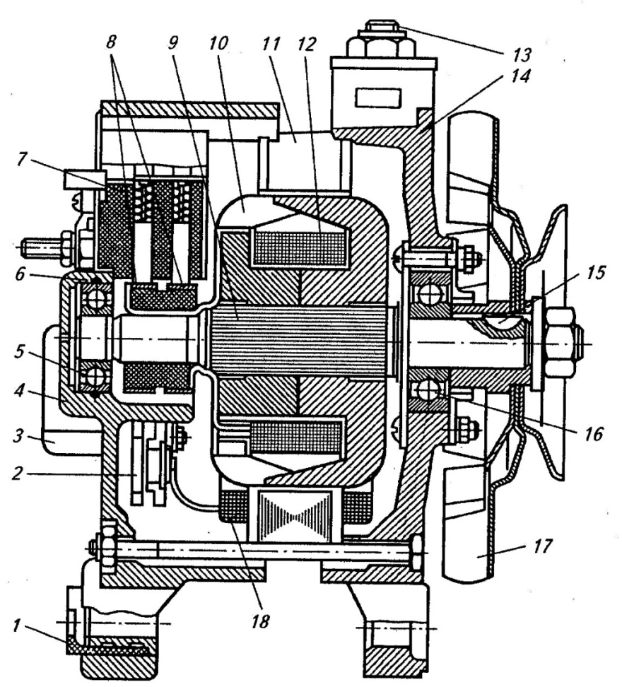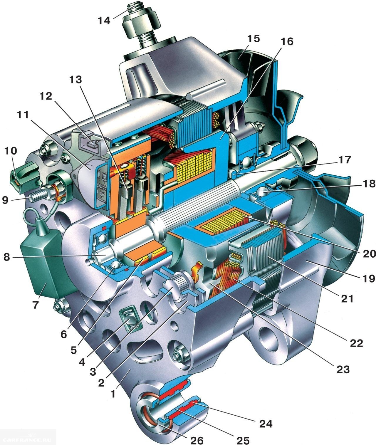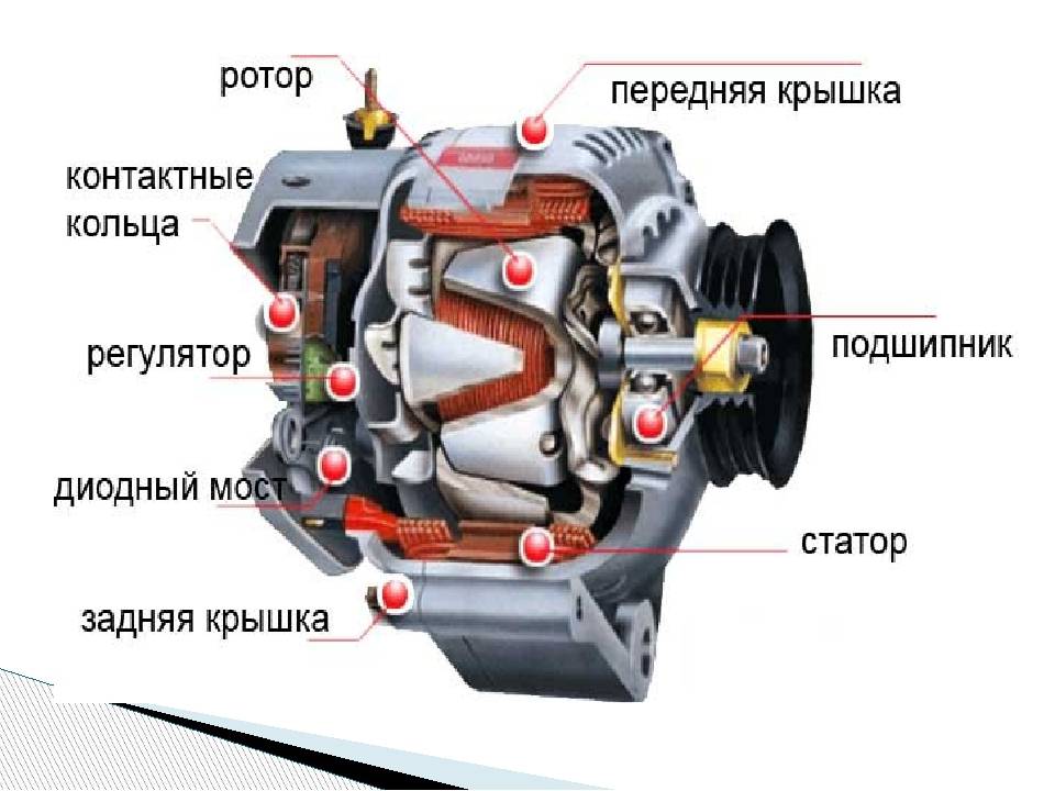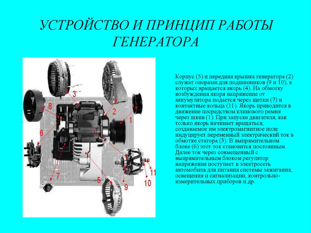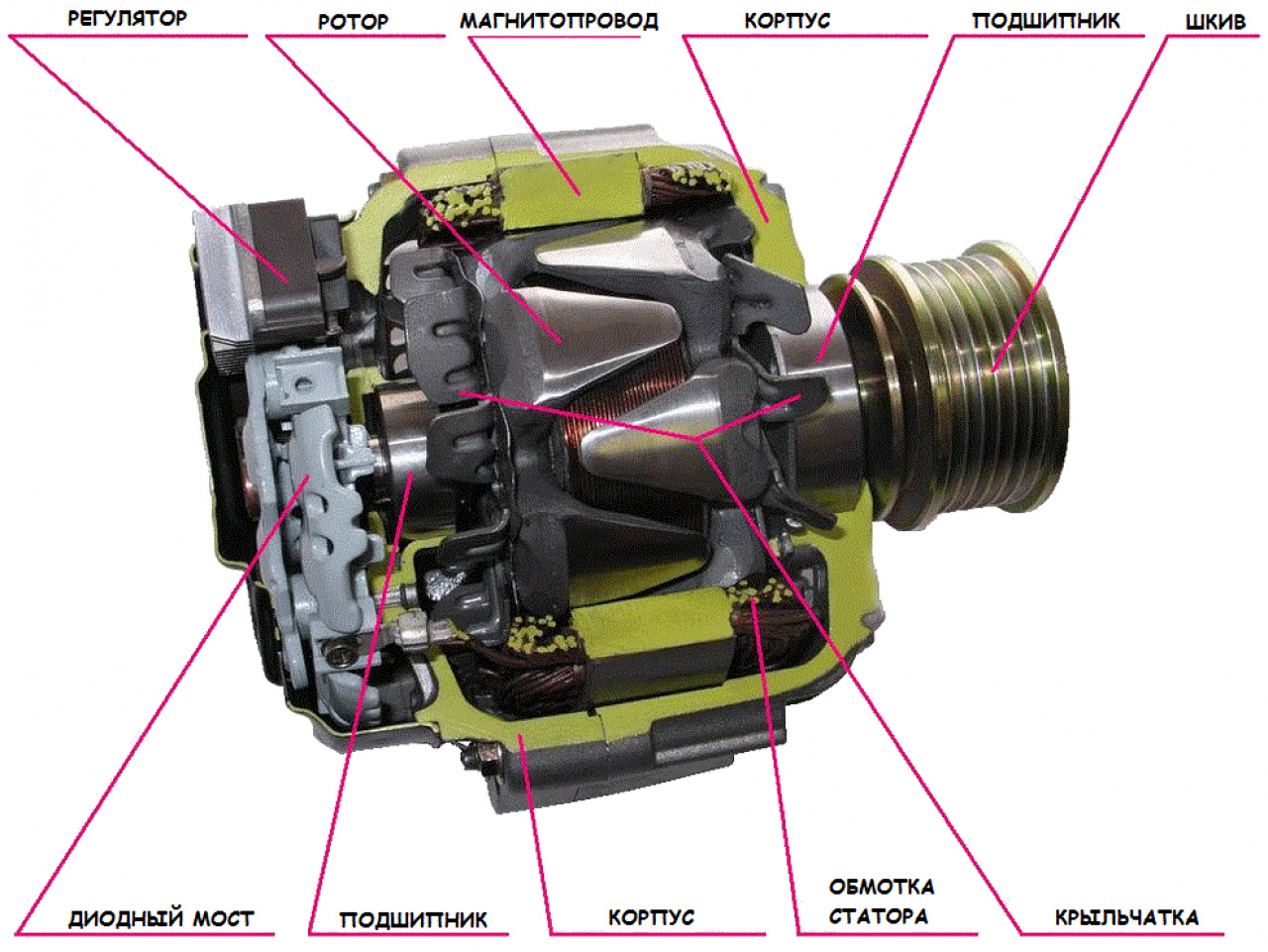 В качестве генераторов на современных автомобилях применяются синхронные машины переменного тока с электромагнитным возбуждением. Так как для питания потребителей и в особенности для заряда аккумуляторной батареи необходим постоянный ток, в генераторы встраивают выпрямители, выполненные на полупроводниковых диодах.