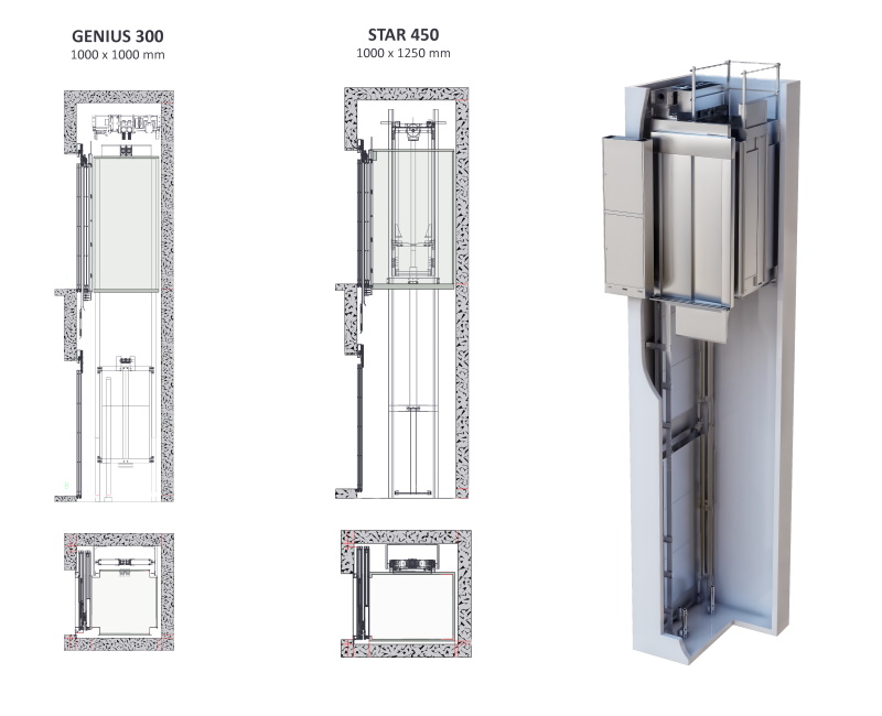 Эти лифты могут обеспечить доступ к трем различным уровням и могут подниматься на высоту до 25 футов. Размеры лифта в футах варьируются от 4 на 4,5 (48 дюймов на 54 дюйма) до 3,5 на 5 (42 дюйма на 60 дюймов).