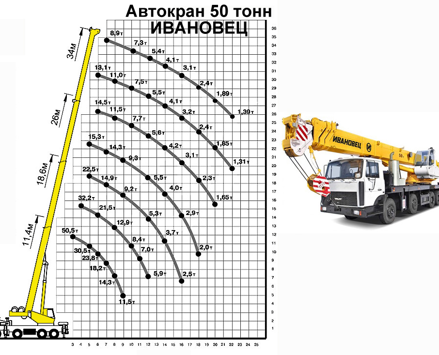 Грузовысотные характеристики автокрана 50 тонн