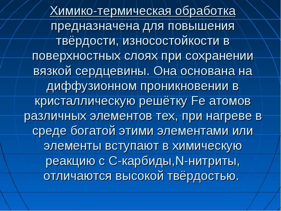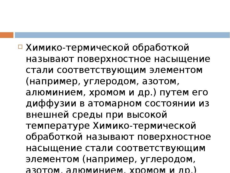 Π₯ΠΈΠΌΠΈΠΊΠΎ-ΡΠ΅ΡΠΌΠΈΡΠ΅ΡΠΊΠ°ΡΒ ΠΎΠ±ΡΠ°Π±ΠΎΡΠΊΠ° ΠΠ°ΡΠ΅Π³ΠΎΡΠΈΡ: Π₯ΡΠ΄ΠΎΠΆΠ΅ΡΡΠ²Π΅Π½Π½ΠΎΠ΅ ΠΌΠ°ΡΠ΅ΡΠΈΠ°Π»ΠΎΠ²Π΅Π΄Π΅Π½ΠΈΠ΅ Π₯ΠΈΠΌΠΈΠΊΠΎ-ΡΠ΅ΡΠΌΠΈΡΠ΅ΡΠΊΠ°ΡΒ ΠΎΠ±ΡΠ°Π±ΠΎΡΠΊΠ° ΠΠ»Ρ ΡΡΠ°Π»ΡΠ½ΡΡ ΠΈΠ·Π΄Π΅Π»ΠΈΠΉ ΠΏΡΠΈΠΌΠ΅Π½ΡΠ΅ΡΡΡ Ρ ΠΈΠΌΠΈΠΊΠΎ-ΡΠ΅ΡΠΌΠΈΡΠ΅ΡΠΊΠ°Ρ ΠΎΠ±ΡΠ°Π±ΠΎΡΠΊΠ°. ΠΠ½Π° Π·Π°ΠΊΠ»ΡΡΠ°Π΅ΡΡΡ Π² ΡΠΎΠΌ, ΡΡΠΎ ΠΏΠΎΠ²Π΅ΡΡ Π½ΠΎΡΡΠ½ΡΠ΅ ΡΠ»ΠΎΠΈ ΠΈΠ·Π΄Π΅Π»ΠΈΠΉ ΠΏΡΠΈ ΠΎΠ΄Π½ΠΎΠ²ΡΠ΅ΠΌΠ΅Π½Π½ΠΎΠΌ Π΄Π΅ΠΉΡΡΠ²ΠΈΠΈ ΡΠ°Π·Π»ΠΈΡΠ½ΡΡ Ρ ΠΈΠΌΠΈΡΠ΅ΡΠΊΠΈΡ ΡΠ΅Π°Π³Π΅Π½ΡΠΎΠ² ΠΈ Π²ΡΡΠΎΠΊΠΎΠΉ ΡΠ΅ΠΌΠΏΠ΅ΡΠ°ΡΡΡΠ΅ Π½Π°ΡΡΡΠ°ΡΡΡΡ ΡΠ³Π»Π΅ΡΠΎΠ΄ΠΎΠΌ, Π°Π·ΠΎΡΠΎΠΌ ΠΈ Π΄ΡΡΠ³ΠΈΠΌΠΈ ΡΠ»Π΅ΠΌΠ΅Π½ΡΠ°ΠΌΠΈ. Π¦Π΅Π»Ρ ΡΠ°ΠΊΠΎΠ³ΠΎ Π½Π°ΡΡΡΠ΅Π½ΠΈΡ β ΡΠ²Π΅Π»ΠΈΡΠ΅Π½ΠΈΠ΅ ΡΠ²Π΅ΡΠ΄ΠΎΡΡΠΈ ΠΏΠΎΠ²Π΅ΡΡ Π½ΠΎΡΡΠ½ΠΎΠ³ΠΎ ΡΠ»ΠΎΡ Ρ ΡΠΎΡ ΡΠ°Π½Π΅Π½ΠΈΠ΅ΠΌ Π²ΡΠ·ΠΊΠΎΠΉ ΡΠ΅ΡΠ΄ΡΠ΅Π²ΠΈΠ½Ρ ΠΈΠ·Π΄Π΅Π»ΠΈΡ, ΠΏΠΎΠ²ΡΡΠ΅Π½ΠΈΠ΅ ΡΡΡΠΎΠΉΡΠΈΠ²ΠΎΡΡΠΈ Π΅Π³ΠΎ ΠΏΡΠΎΡΠΈΠ² ΠΊΠΎΡΡΠΎΠ·ΠΈΠΈ, ΠΏΡΠΈΠΎΠ±ΡΠ΅ΡΠ΅Π½ΠΈΠ΅ Π½ΠΎΠ²ΡΡ Π΄Π΅ΠΊΠΎΡΠ°ΡΠΈΠ²Π½ΡΡ ΡΠ²ΠΎΠΉΡΡΠ², Π° ΡΠ°ΠΊΠΆΠ΅ ΠΆΠ°ΡΠΎΡΡΠΎΠΉΠΊΠΎΡΡΠΈ, ΡΠΎΠΏΡΠΎΡΠΈΠ²Π»Π΅Π½ΠΈΠ΅ ΠΈΠ·Π½ΠΎΡΡ, ΠΈΡΡΠΈΡΠ°Π½ΠΈΡ ΠΈ Ρ. ΠΏ. ΠΡΠΎΡ ΠΏΡΠΎΡΠ΅ΡΡ ΠΎΡΠ½ΠΎΠ²Π°Π½ Π½Π° ΡΠΏΠΎΡΠΎΠ±Π½ΠΎΡΡΠΈ ΡΠ°Π·Π»ΠΈΡΠ½ΡΡ